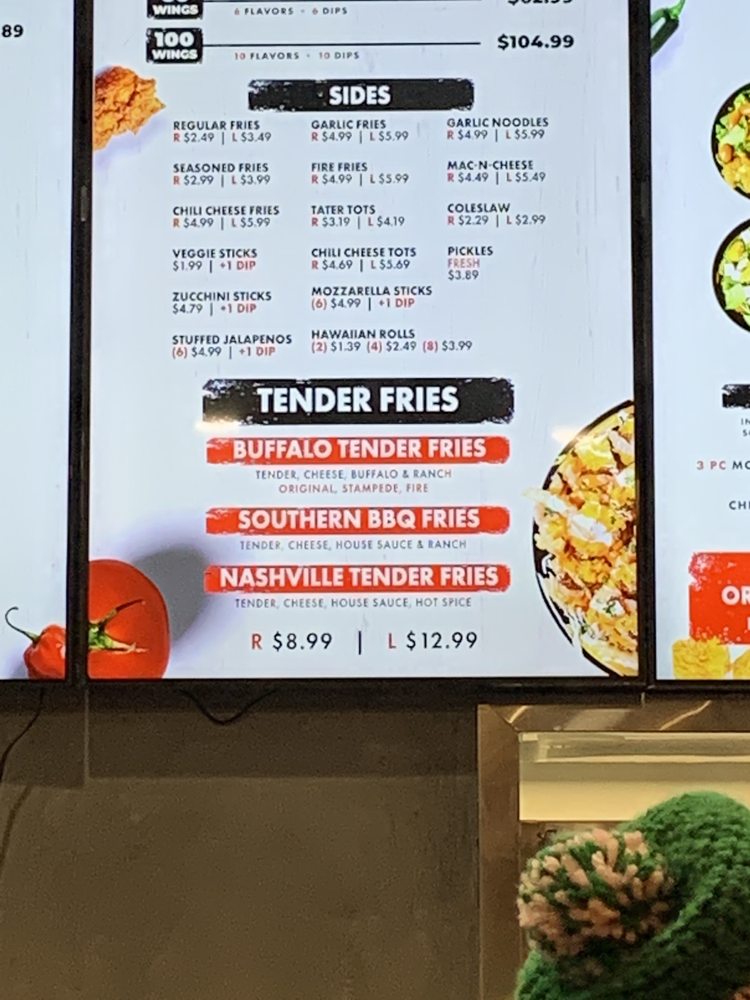 Comes with 3 Large Sides, Seasoned Fries, 3 Veggie Sticks, and 10 Dips